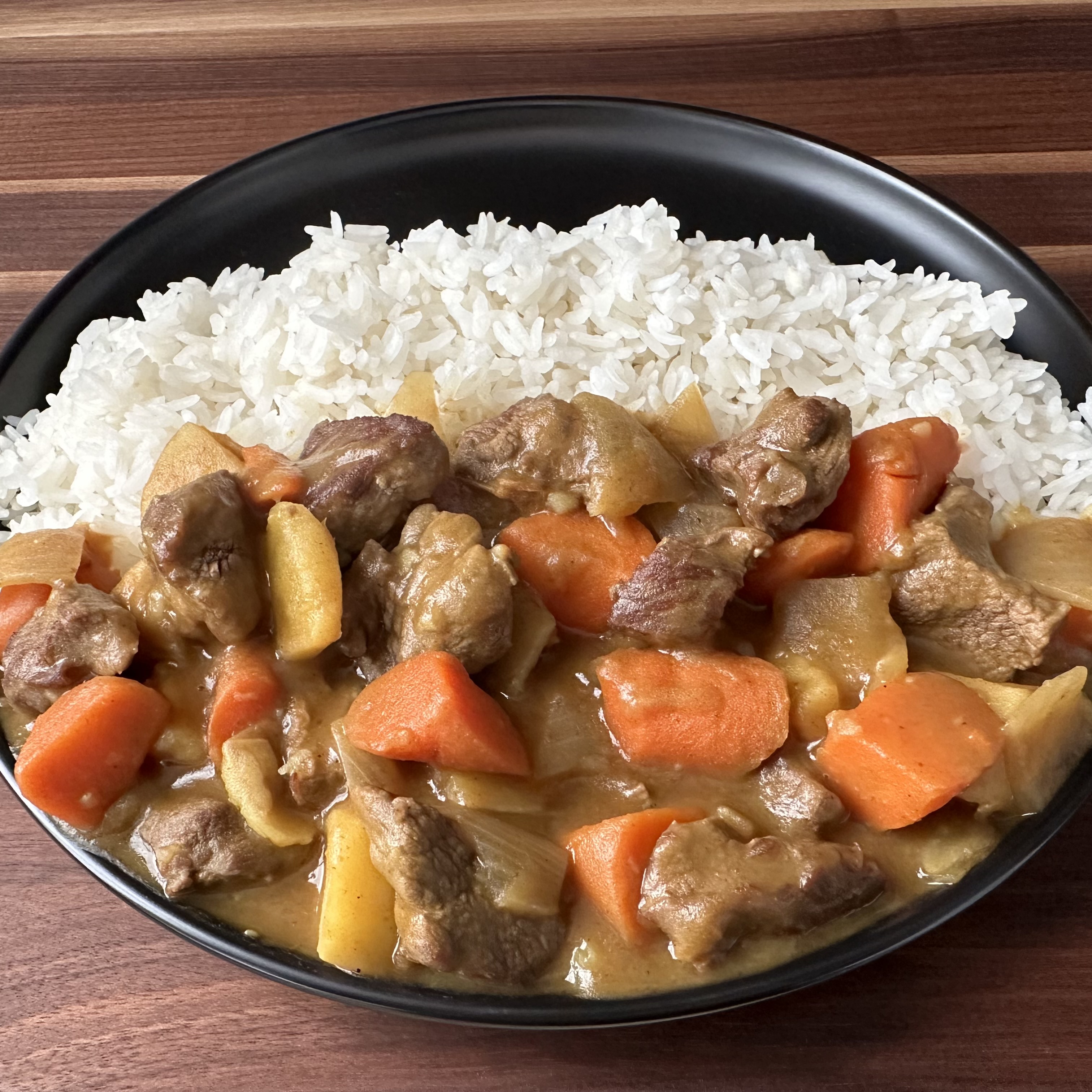 Curry over rice, made with beef, pork, chicken, onions, carrots, potatoes, etc.