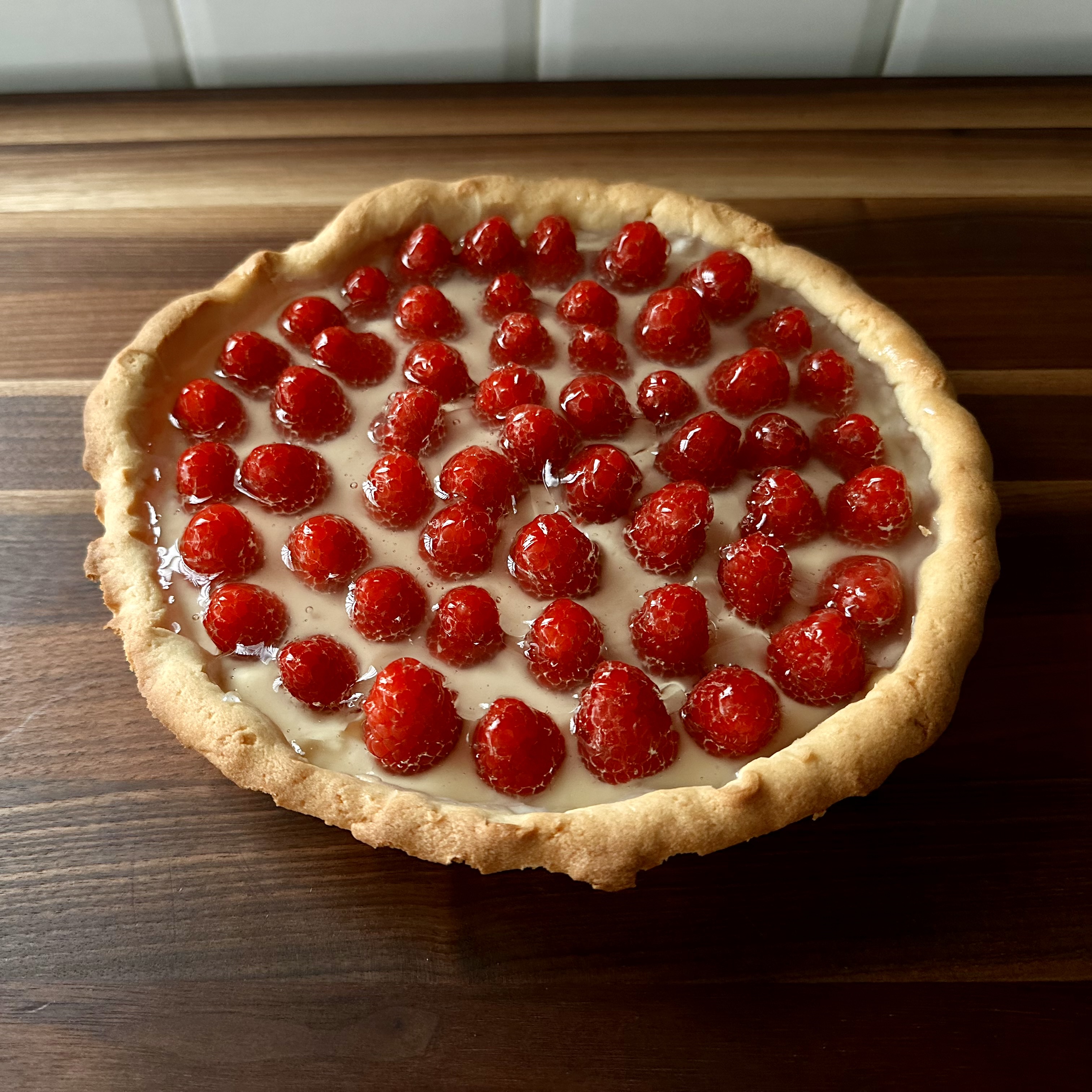 Delightfully fresh raspberry tart with pastry cream and a buttery shortbread crust...