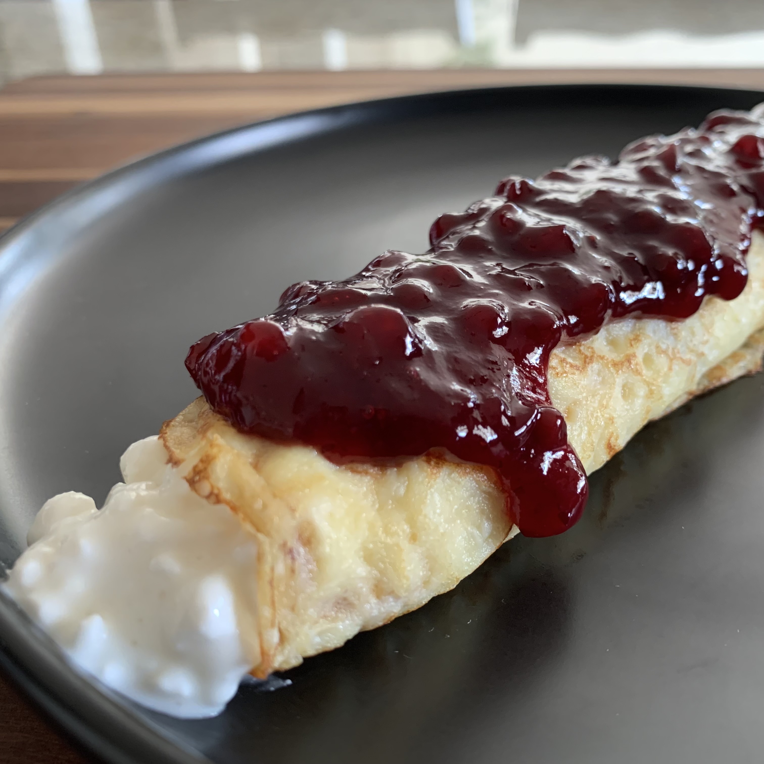 Rolled crepes filled with cottage cheese and topped with lingonberry jam or strawberry preserves. Our family's favorite breakfast...