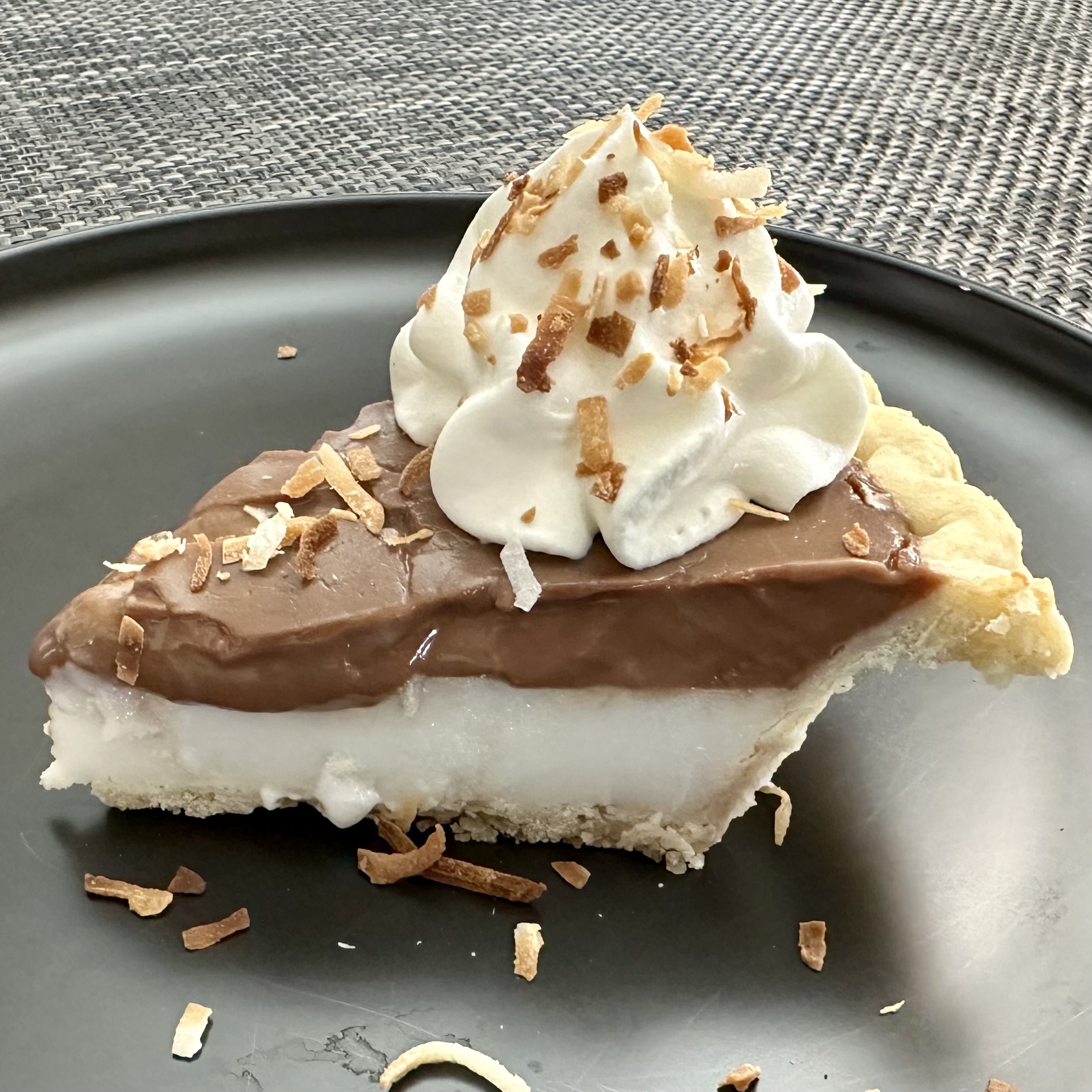 A Hawaiian favorite! Coconut pudding pie topped with chocolate...