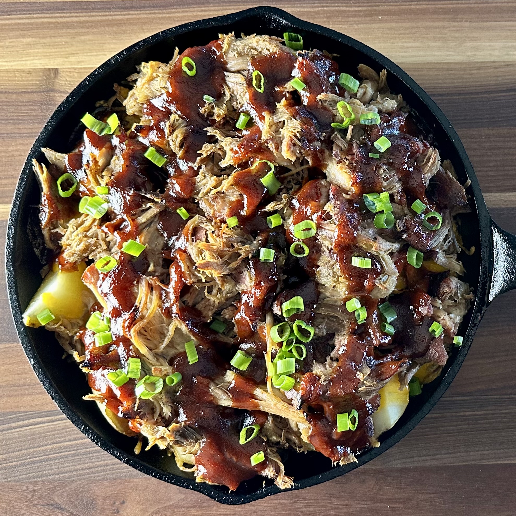BBQ pulled pork on baked potato chunks, topped with BBQ sauce, cheese and green onions, a menu item at Pig -N- Whistle in Millington, Tennessee